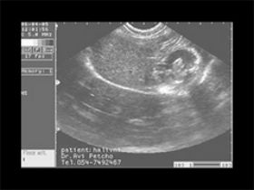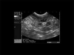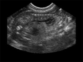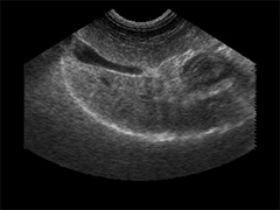 עובר כלב בן 6 שבועות כפי שהוא נראה באולטראסאונד. הקיווקווים הם הצלעות ב"חתך". ניתן להבחין בבועית הקיבה ובית החזה